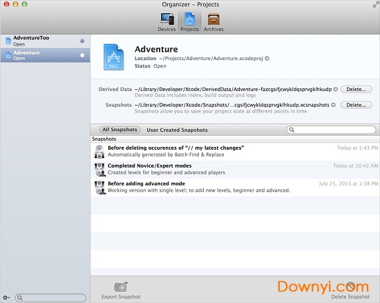 您可以通过restore snapshot命令将整个项目恢复至此前版本的快照.快照使得备份工程当前版本变得非常容易.你可以通过file > create snapshot创建快照,也可以在执行大量编辑操作之前将xcode设置为自动创建快照,并将其作为工作流的一部分.