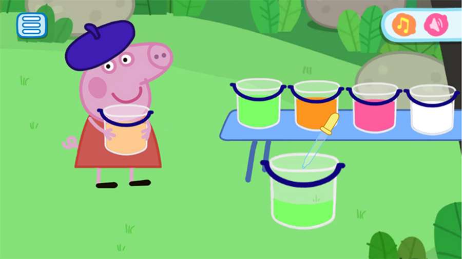 4、混合色peppa有油漆的桶,帮助peppi创建完全相同的颜色。你必须混合的颜色。添加额外的油漆空桶,混合的颜色,看看颜色,你得到的。有趣的教育迷你游戏的孩子中,孩子学会通过混合不同的颜色来创造所需的颜色。