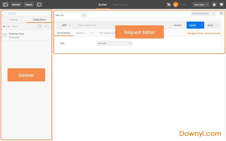 postman界面分为两部分:左边的sidebar 右边的request builder:快速创建几乎所有的请求