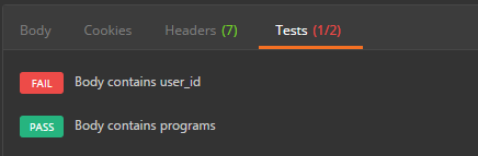 本质上是javascript code,可以为tests object设置values。这里使用描述性文字作为key,检验body中的各种情况,当然你可以创建任意多的key,这取决于你需要测试多少点。 tests也会随着request保存到collection中。api测试保证前端后台都能正常的于api协作工作,而不用在出错时猜测是哪里的问题。 需要在request的test中创建了test后,再进行request,test的结果在body的test中查看。 注意: 1.这里的key描述必须是唯一的,否则相同描述只会执行第一个。 2.这里的key可以使用中文。 例子: tests[“body contains user_id”] = responsebody.has(“user_id”)这里描述性的key为:body contains user_id。检测点为:responsebody.has(“user_id”),意思是检测返回的body中是否包含”user_id”这个字段。查看responses中的tests结果:记过显示每个key,也就是我们测试点的具体结果,是否通过。