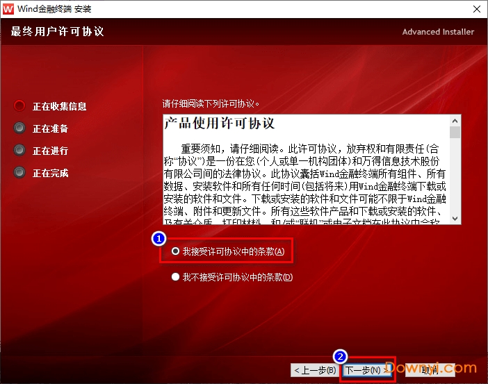 1、在当易网下载wind金融终端官方版,并解压压缩包“wft_setup_chs.zip”,得到文件“wft_setup_chs.exe”,双击进入安装界面,直接点击“下一步”: