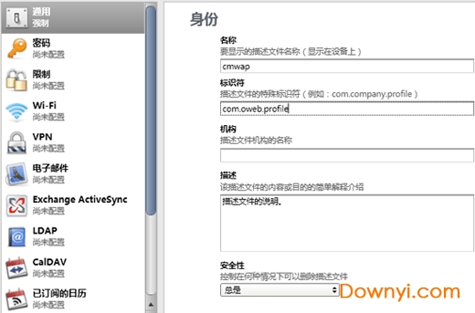 打开iphone配置实用工具,点文件→新建配置描述文件,在“名称”处随便填你想要的名字,比如“cmwap”;“标识符”里也是按照格式随便填,比如“com.oweb.profile”,其他的可以不填。