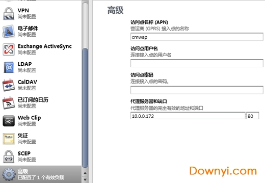 然后再点“高级” ,在“访问点名称(apn)”填“cmwap”,在“da1l1服务器和端口”处填“10.0.0.172:80”。