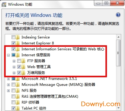 第三步需要注意的是,选中红框中的复选项,分别为internetinformationservices可承载的web核心;、;web管理工具;和;万维网服务;,这里我不确定;web管理工具;是否需要,因为我选中它们的父节点;internet信息服务;后选中了它的一些子项,多选总比少选全面,需要将它们的子项全部选中才显示为;√;,否则显示为;■;,记住,一定要显示为;√;才行,效果就和step3一样就可以了!点击确定后会出现线面的框框
