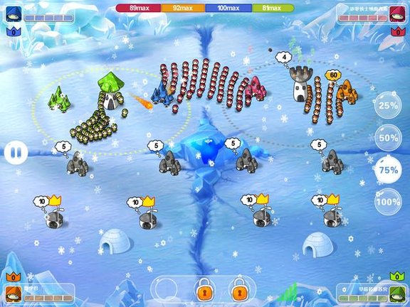 如果在场景中,建筑物头上冒出sos的信息,那就证明该建筑物即将面临对方的侵略,所以,我们必须从最近的建筑物进行调配人手进行防御(操作方法:点击己方建筑物,拖动到需要支援的建筑物即可)