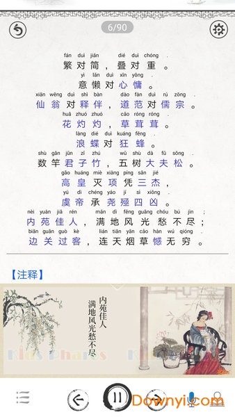 笠翁对韵图文有声国学软件由专业的国学团队制作,每章节的内容均配有“白云出岫”老师深情的朗诵、准确的拼音、全面的注释、甜美的译文、易懂的启示、有趣的故事、水墨风插画、还有实用/易用的跟读背诵学习功能。