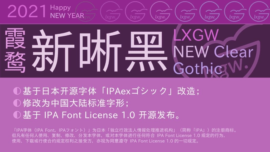 霞鹜新晰黑是一款衍生于IPAexゴシック的简体中文黑体字型。这是一款基于IPAex黑体的中文开源字体,是将日本写法的字体改造成简体中文写法的尝试。