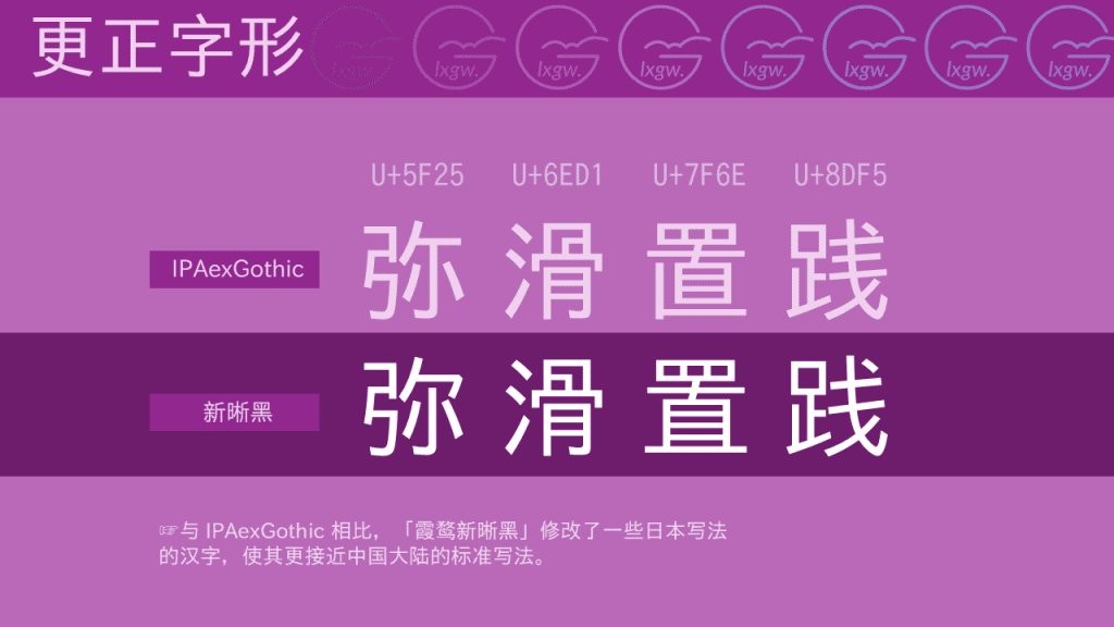 本字体尝试在IPAex黑体和霞鹜晰黑原有字形的基础上,将其改造成中国大陆的标准字形,更加适合中国大陆当易网用户的需求。