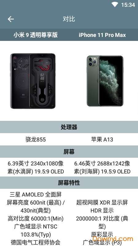 3、查看手机的屏幕尺寸、分辨率及材质电池容量,充电规格和相机评测机构dxomark分数。可对手机进行评分和查看评分。