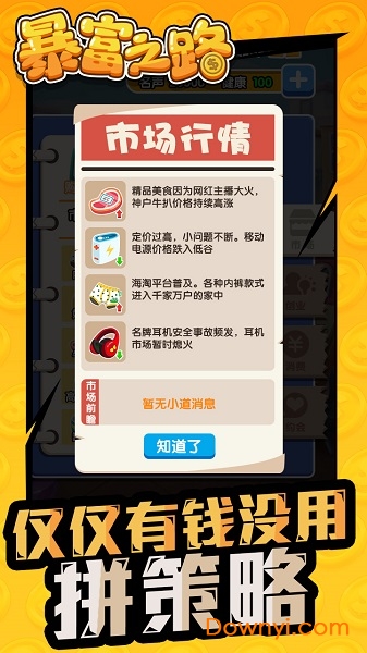 暴富之路内购最新版玩家们体验暴富的一生。游戏中玩家们是从20开始到70结束,玩家们需要在这五十年间完成各种商业投资,让你不仅成为富人更要成为有名望的人。游戏中有各种行情为你的投资提供帮助!