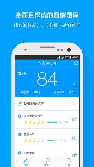 目标考试类型覆盖公务员,教师,司考三大类,根据考试目标提供不同的题库和直播课。