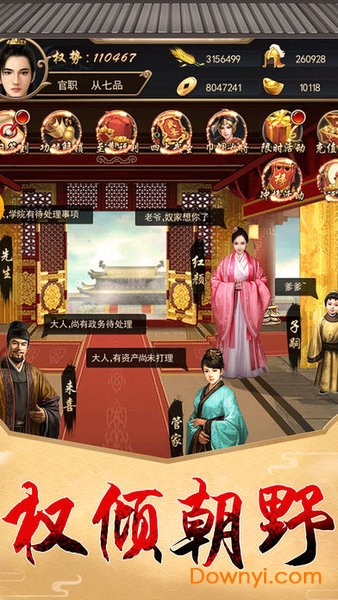 以古代官场为背景的养成类角色扮演游戏。在这款游戏中玩家们将从一名无名小官一步步走到宰相的位置,这之间要经历多少的尔虞我诈只有你自己知道,但是一切都是值得的,你实现了人生理想,同时佳人在怀,儿女成双,为了这样完美的结局,你必须使出浑身解数,解决一切难题!