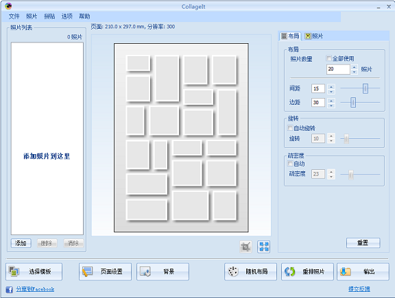 轻松设计您的图片拼贴与提供的可变参数,如照片数量,照片空间,页边距,旋转和稀疏。