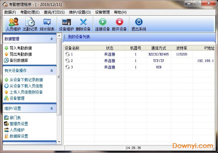 1、将设备上的考勤数据下载至软件中。(连接设备à从设备下载记录数据)