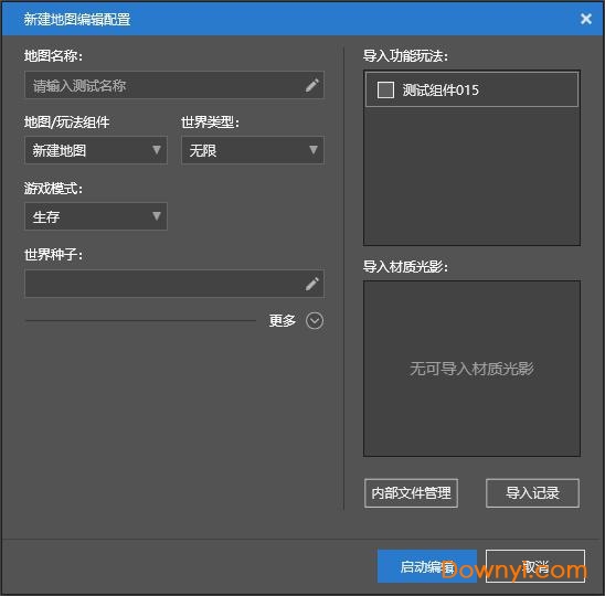 在弹出的对话框中,可以进行基本的地图设置。如果mc studio中已经有非地图类型的c++作品,那么会显示在“导入功能玩法”、“导入材质光影”的列表中。导入的功能玩法和材质光影的文件会拷贝一份到新建地图中(所以只需导入一次即可)。