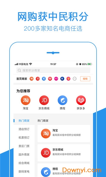 app在手,随时随地下单获中民积分!中民积分宝携手200+知名电商网站,包你衣食出行无忧,让网购更省钱!