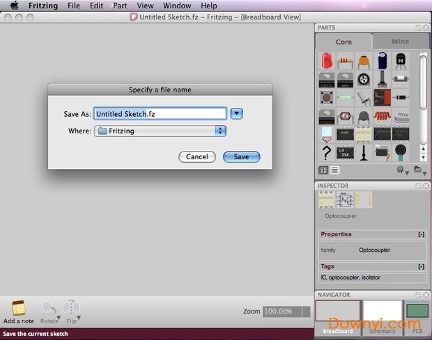 让我们开始打开fritzing,命名并保存我们的项目。强烈建议在开始时以及在工作时不时保存项目,因为fritzing仍然是alpha,不幸的是有时可能会崩溃...