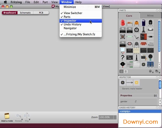 从fritzing菜单栏中,选择window>,然后标记您要在环境中看到的调色板窗口。
