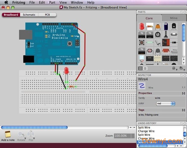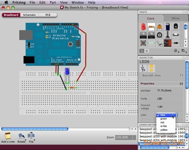 对艺术家或是非电子信息背景的人来说,frizing算是很好上手的工具,你可以很简单方式拖拉元件以及连接线路。