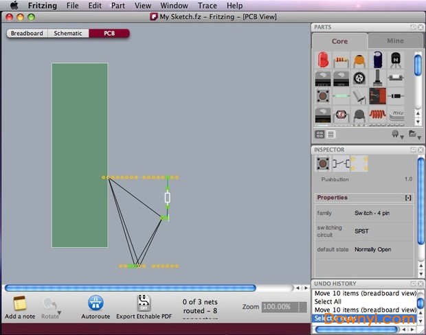 提供了一系列电子零件,您可以直接将它们拖放到项目视图中。零件排列在垃圾箱中。fritzing带有一个核心箱,该箱具有不错的零件集合,但是它也允许您创建自己的零件箱(“矿”箱),因此您可以根据需要组织核心零件和自定义零件。例如,您可以在处理项目时创建容器,仅放置该项目中涉及的零件,也可以为特定类型的零件(例如电阻器)创建容器。此功能对保持事物整洁并更快地访问零件组很有用。