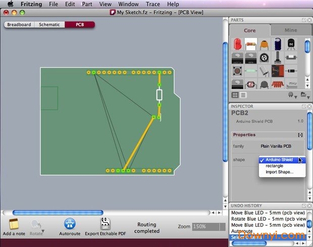 您也可以在pcb视图中更改零件的属性。板的形状可以更改为arduino屏蔽,可调整大小的矩形或自定义形状。