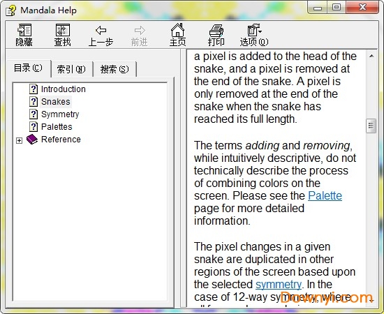 mandala是万花筒绘画软件,可以帮助用户在软件上设计新的万花筒,该软件设计的结果是动态的,你可以通过软件的设置功能帮助你配置颜色,配置snakes的数量以及分辨率,通过简单的设置就可以生成一份动态的图像!