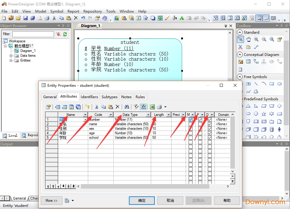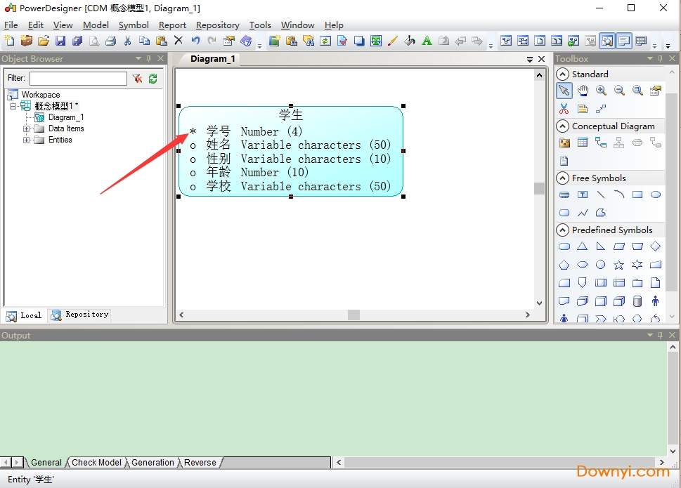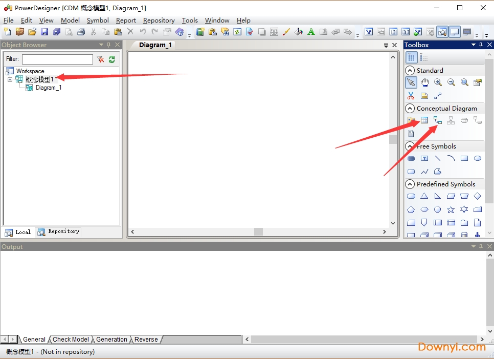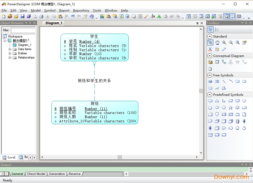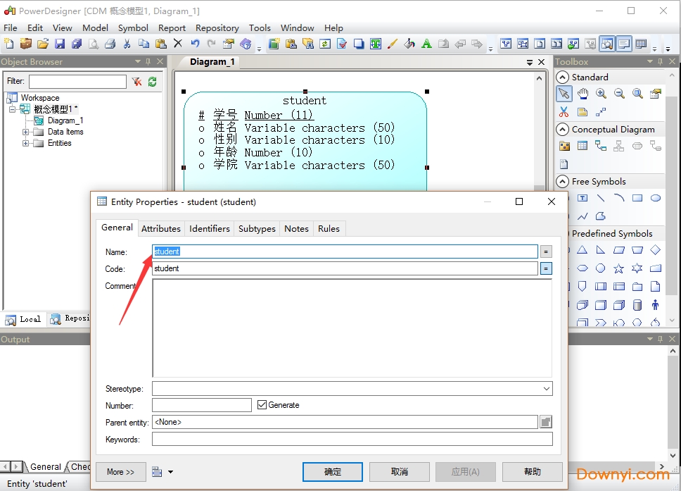 点击上面的ok,即可出现下图左边的概念模型1,自己起得概念模型的名字,使用最多的就是如图所示的那两个entity(实体),relationship(关系)