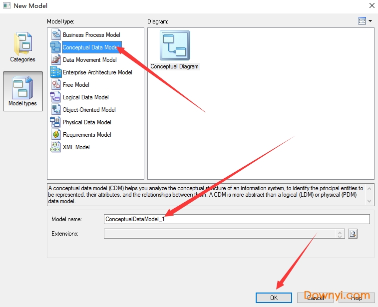 首先创建概念数据模型,如图所示(后面介绍一些比如物理数据模型等等,由于此软件全部是英文的,所以作为一个chinese不是很懂的,耐心的多使用几次就好了。)