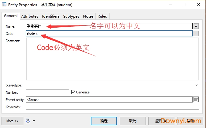 5:general中的name和code填好后,就可以点击attributes(属性)来设置name(名字),code(在数据库中的字段名),data type(数据类型) ,length(数据类型的长度)