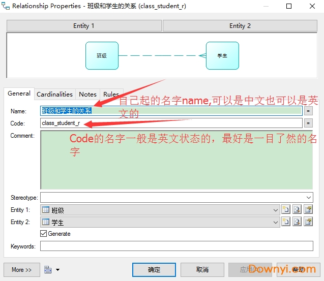 (需要注意的是点击relationship这个按钮,就把班级和学生联系起来了,就是一条线,然后双击这条线进行编辑,在general这块起name和code)