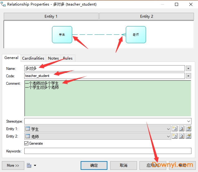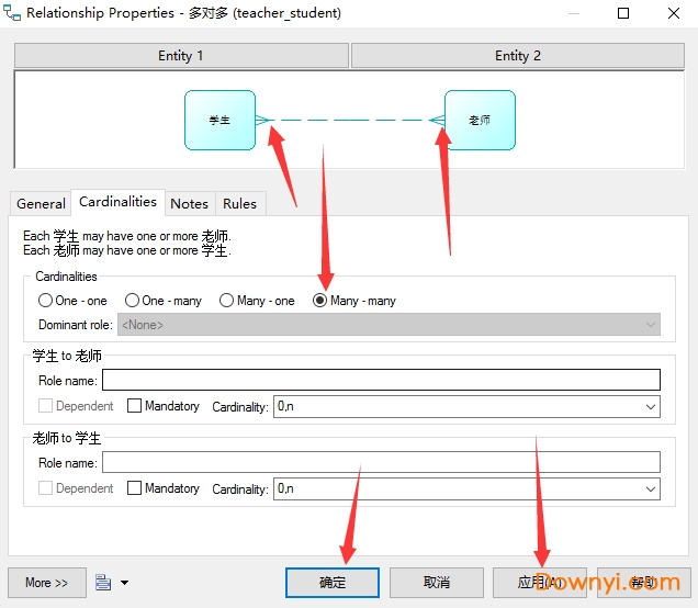 (多对多需要注意的时自己可以手动点击按钮将关系调整称为多对多的关系many对many的关系,然后点击应用和确定即可)
