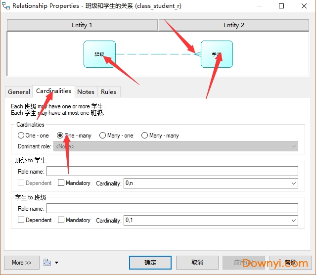 (上面的name和code起好后就可以在cardinalities这块查看班级和学生的关系,可以看到班级的一端是一条线,学生的一端是三条,代表班级对学生是一对多的关系即one对many的关系,点击应用,然后确定即可)
