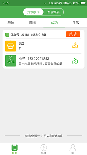 配送员app还可以直接对配送中的订单进行状态操作,例如把订单设为配送成功或配送失败状态。