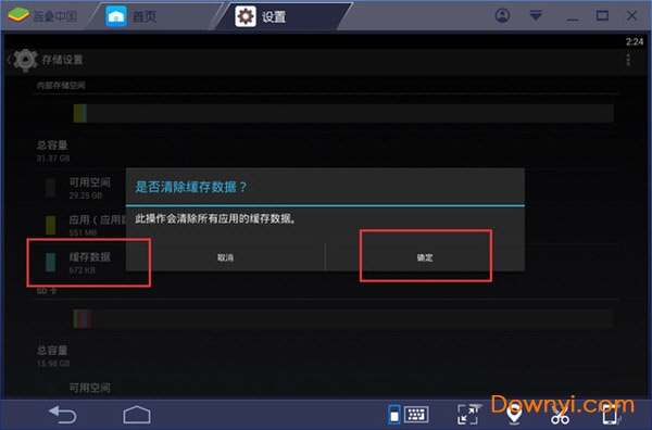 4、来到“存储”界面后先等它扫描完毕,之后点击“缓存数据”就可以清理蓝叠安卓模拟器所有应用的缓存了;
