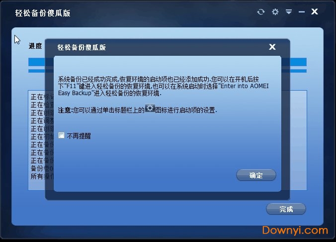 5、完成之后会弹出一下对话框,点击“确定”关闭该对话框;点击“完成”你的系统备份就轻松搞定了。