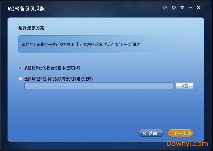 2、由于我之前选择的是把镜像文件保存在轻松备份的恢复分区中,所以我还原也是选择第一个选项。然后点击“下一步”(如果你在之前备份时选择的是保存到其他路径,那么你在此也就选择第二个选项)。
