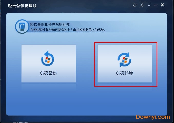 1、来到轻松备份傻瓜版主界面选择“系统还原”。
