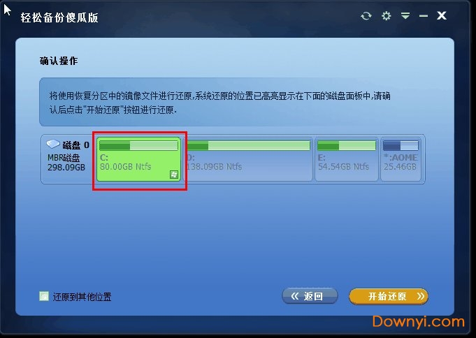 3、关于系统还原的位置,程序会自动选择还原到原位置,本次默认还原到c盘。点击“开始还原”所有操作就轻松完成了。