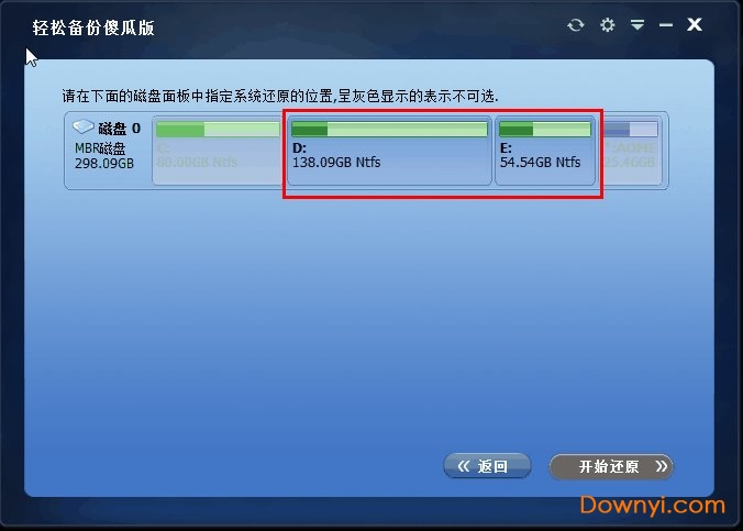 3、选中一个分区作为恢复分区的位置,点击“开始备份”。
