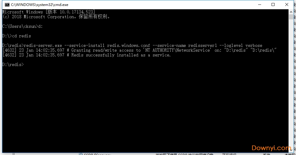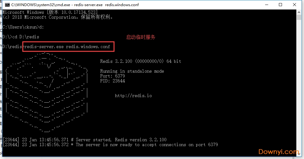 1.打开cmd,进入到刚才解压到的目录,启动临时服务:redis-server.exe redis.windows.conf (备注:通过这个命令,会创建Redis临时服务,不会在window Service列表出现Redis服务名称和状态,此窗口关闭,服务会自动关闭。)