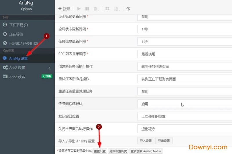 请重置一下ariang的设置,依次点击下图中的1和2,然后在弹出的对话框中确认重置即可!