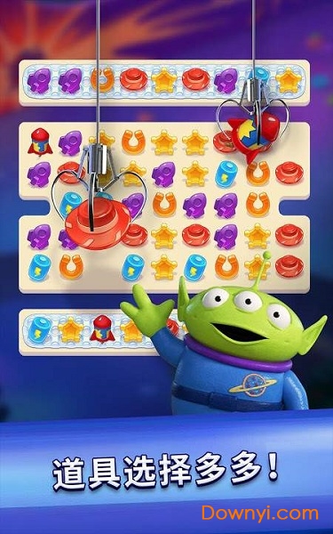 - 召唤玩具道具来帮助你过关,用“抓手”来交换游戏单品,用“外星人飞碟”吸走需要清除的单品,用“神奇画板”随机打乱整个游戏版面获得更佳组合