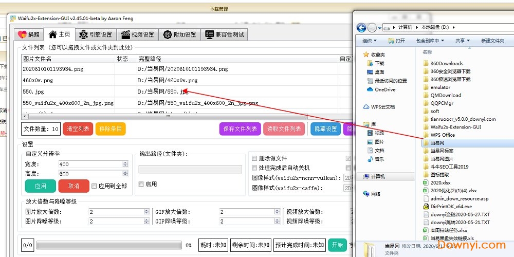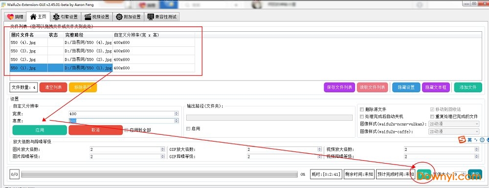 1.把你下载的图片文件夹移到这个里面,然后下面设置一下高度和宽度,选择要放大的图片,然后点击开始就可以实现批量放大了。