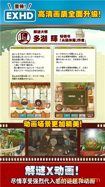 本作还在原版的基础上,增加了全新的动画剧情。新的平台和新的优化,相信会给老玩家们带来全新的感受。轻松易上手的点触式操作、简洁干净的绘本风画面、打动人心的跌宕情节、古典又富有幻想的主题和背景音乐,激发玩家挑战欲和想象力的各式谜题,都是“雷顿”系列作品为玩家们津津乐道的巨大魅力。