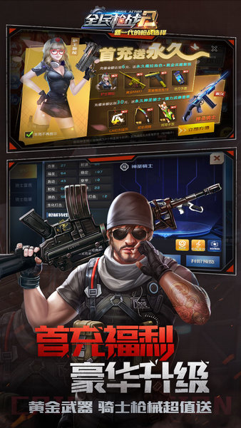 首充功能改版、福利全面升级!6元得永久稀有角色、黄金武器套装!30元得神圣骑士武器、全新近战、全新手雷!专属福利,不要错过~