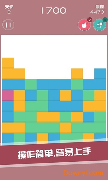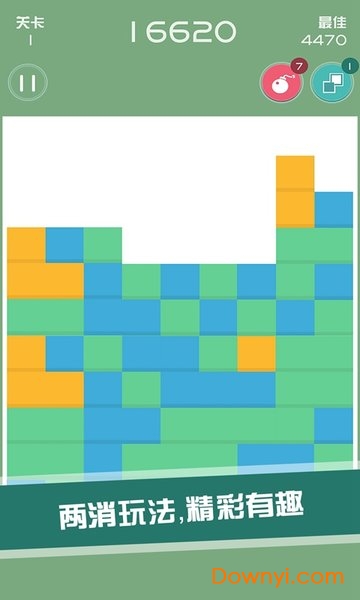 这属于简约小清新画风的休闲益智游戏,落落下方有着类似消灭星星的游戏玩法,通过消除相同颜色的方块来获得分数,消灭完就能前往下一关,简单的规则,有趣的消除过程。