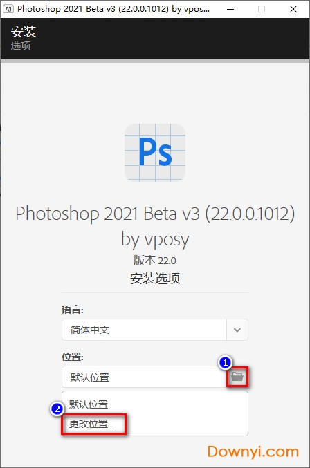 2、点击①处的文件夹图案,再点击②“更改位置”修改安装路径