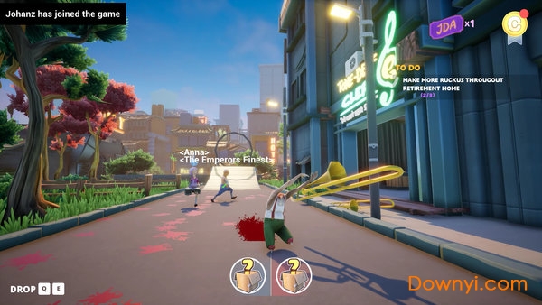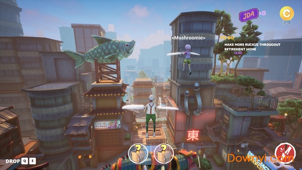 拾取各种各样的物品并与之互动,包括巨型鲑鱼、蹦床、枪支、电线和花炮,等等。火箭筒、斧子、长号、喇叭和喷射背包,等等等等,没错,它们全都可以用来伤人致残。