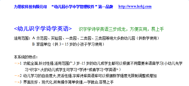 幼儿学习的自由度大,灵活性强,字库诗库英语库可以根据教学强度无限制调整或增加;界面友好、现代化,所有操作简单快捷,一学就会,容易上手