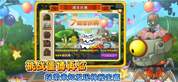 僵尸博士回来了!僵博竞速赛再启,在三轮挑战中前往不同的时空,击败博士的机甲将会掉落周年水晶,可在限时转盘中抽取海量奖励,七周年庆典专属植物铜钱草鼓手也在其中哦!